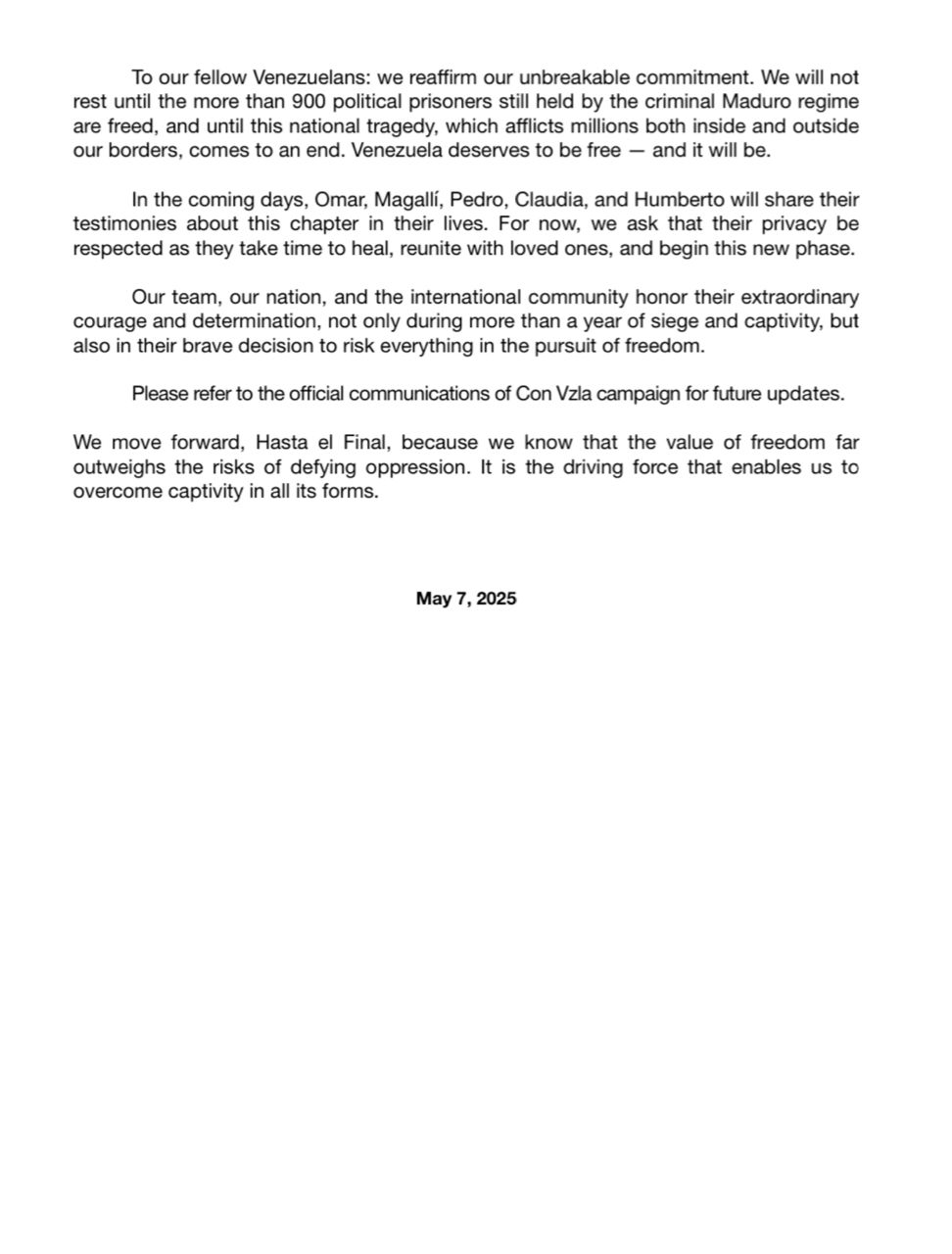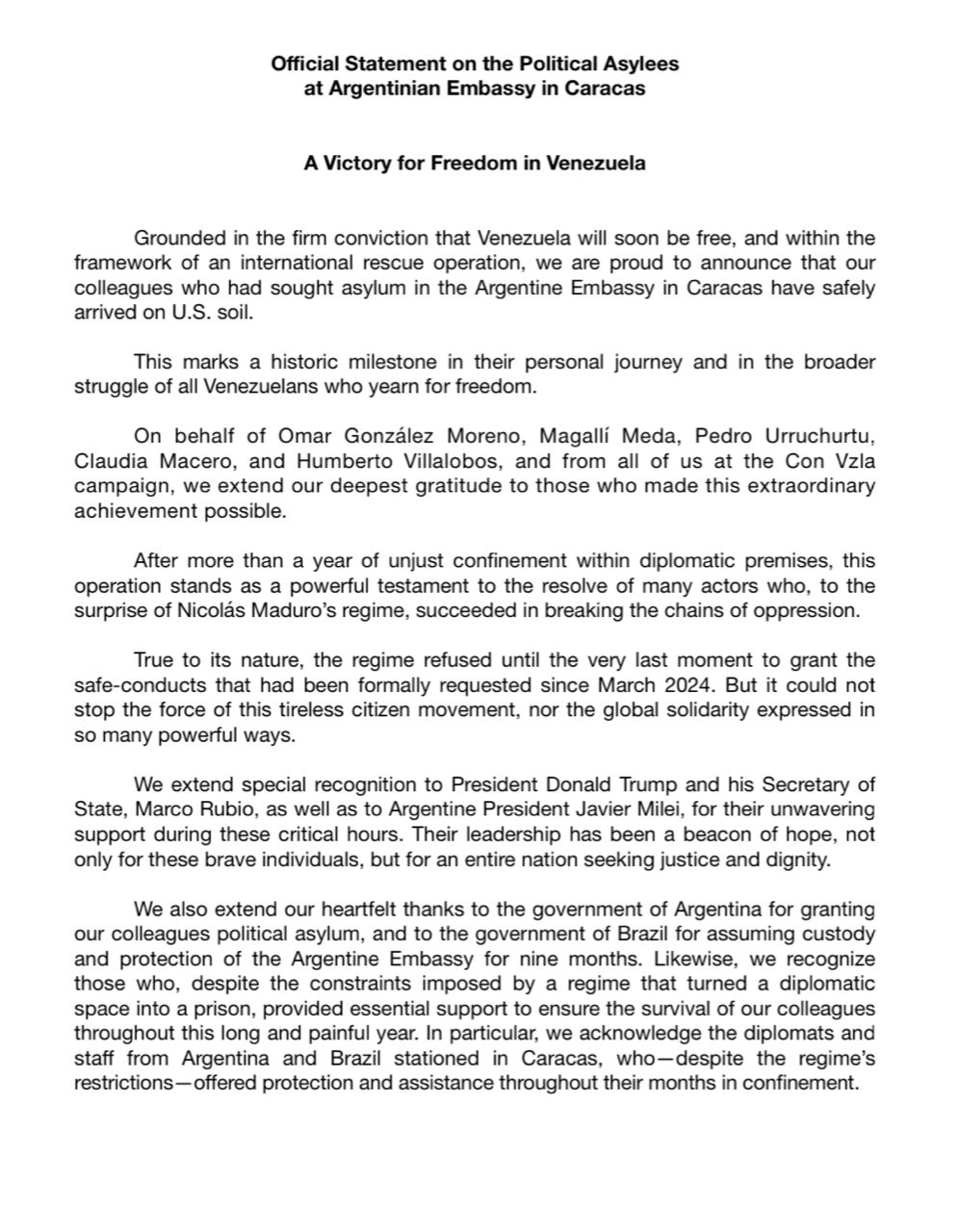 Este hito marca un nuevo capítulo en su lucha y en la de todos los venezolanos que anhelamos libertad. En nombre de Omar González Moreno, Magallí Meda, Pedro Urruchurtu, Claudia Macero y Humberto Villalobos, y desde el Comando Con Vzla, expresamos nuestra más profunda gratitud a todos los que hicieron posible esta acción histórica.